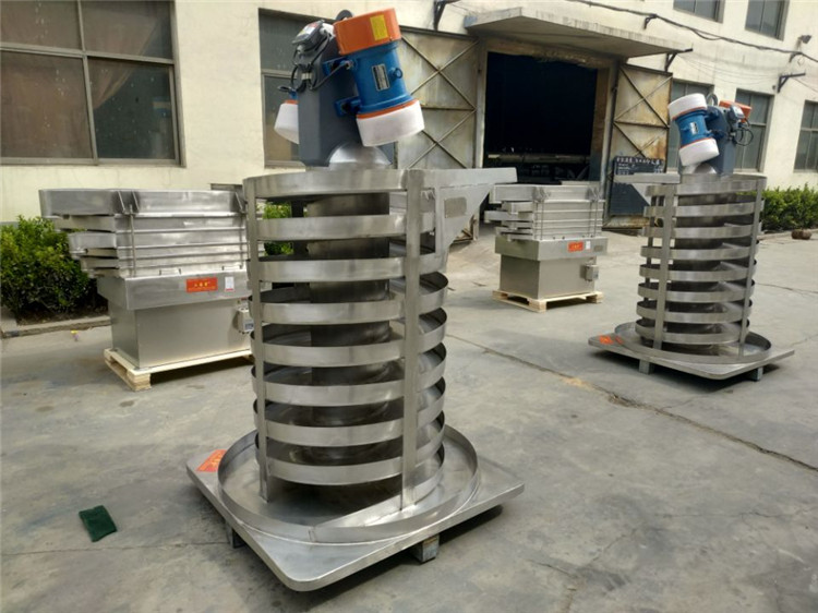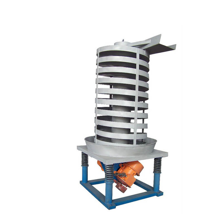 垂直振動輸送機的驅(qū)動裝置振動電機安裝在輸送塔下部,兩臺振動電機對稱交叉安裝,輸送塔由管體和焊接在管體周圍的螺旋輸送槽組成,輸送塔座于減振裝置上,減振裝置由底座和隔振彈簧組成。當(dāng)垂直輸送機工作時,根據(jù)雙振動電機自同步原理,由振動電機產(chǎn)生激振力,強迫整個輸送塔體作水平圓運動和向上垂直運動的空間復(fù)合振動,螺旋槽內(nèi)的物料則受輸送槽的作用,作勻速拋擲圓運動,沿輸送槽體向上運動,從而完成物料的向上(或向下)輸送作業(yè)。